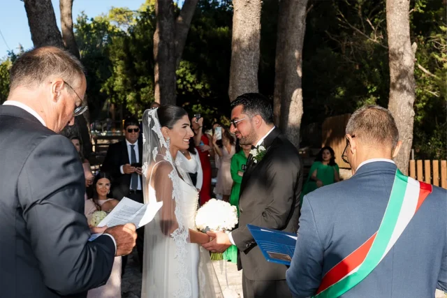 The bride arrived walking down an aisle of white flowers, carefully designed by Capriflor Domenico Ruggiero. A scene that captured everyone’s gaze. Simon watched her approach with emotion as the sun still shone on the horizon.